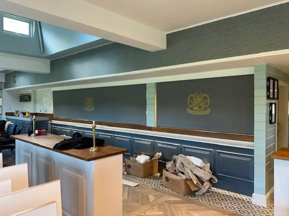 Installed Extra wide motorised digitally printed roller blinds. Remote control handset for designated users only. Blinds branded with club logo.