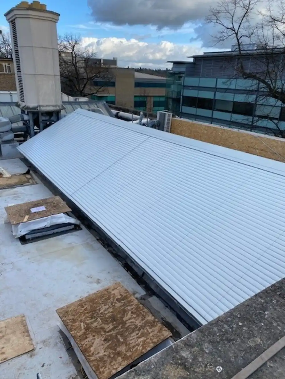 Installed Motorised T.80 Exterior Sunshields to 2 large, angled skylight windows. Multiple blinds were installed to each skylight. Opening windows were fitted with individual blinds to allow them to open independently to aid airflow through building in warmer months.