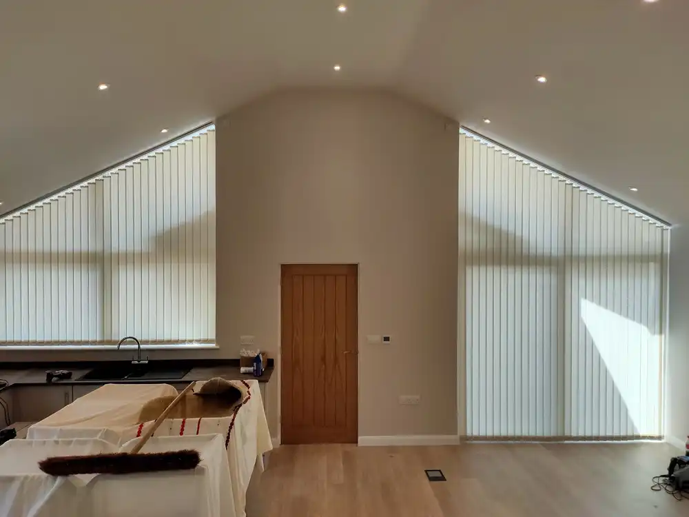 Solution: Installed bespoke Benthin sloping motorised 89mm vertical louvre blind systems with handheld remote control, delivering perfect coverage for this challenging window configuration.